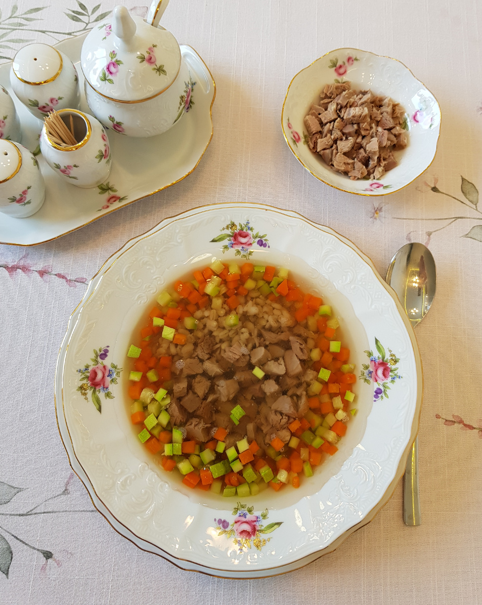 Добрый день, дорогие друзья! В Сибири дует свежий ветерок, и температура опускается ниже +10 ночью, и поэтому самое время согреться насыщенным, горячим, нежным блюдом по рецепту Огюста Эскофье, приготовленным на основе консоме из ягненка. Для приготовления нам понадобятся: 1 литр консоме из ягненка, 500 грамм отварного мяса ягненка, 135 грамм вареной перловки (45 грамм крупы), 135 грамм моркови, 135 грамм кабачка, 1/2 чайной ложки соли. Приготовление: морковь и кабачок нарезать мелким кубиком. В подсоленный кипяток опустить морковь. Через 5 минут добавить кабачки. Варить еще 5 минут. Слить воду с овощей, мясо ягненка нарезать кубиком. Разогреть консоме и добавить в него перловку, овощи и мясо. Приятного аппетита! Ссылки на другие консоме с гарнирами:
