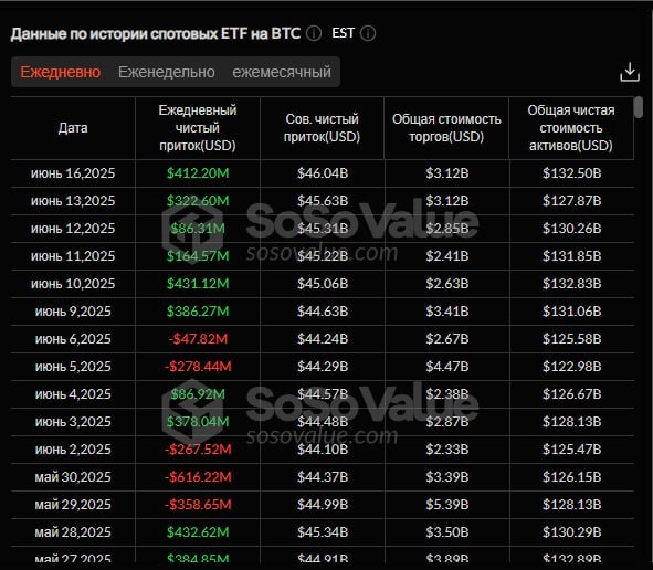 🔸16 июня спотовые биткоин-ETF зафиксировали общий чистый приток в размере $412 млн, что стало шестым днём подряд чистого притока