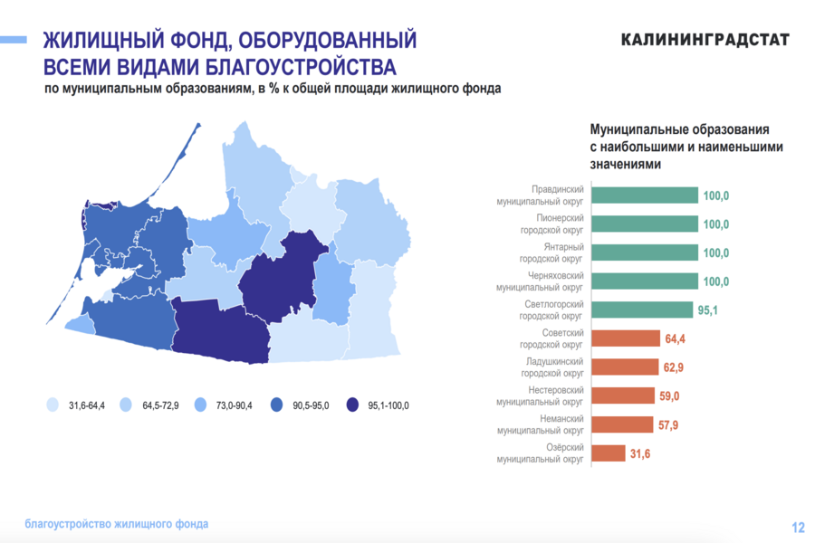 В Озёрском округе лишь 31,6 % жилищного фонда оснащено всеми основными видами благоустройства — водопроводом, отоплением, канализацией (водоотведением), газом и горячим водоснабжением. Такие данные приводит Калининградстат. В список муниципалитетов с наименьшей долей благоустроенного жилья также вошли Неманский (57,9 %), Нестеровский (59 %), Ладушкинский (62,9 %) и Советский (64,4 %) округа. Полностью благоустроенными признаны четыре муниципалитета — Правдинский, Пионерский, Янтарный и Черняховский. Изображение: Калининградстат «Общая площадь жилых помещений, оборудованная всеми видами благоустройства на конец 2024 г., составила 34,2 млн кв. м, или 90,5% всего жилищного фонда. Водопроводом оборудовано 97,9% жилищного фонда, отоплением — 97,2%, водоотведением (канализацией) — 96,0%, газом (сетевым, сжиженным) — 95,3%, горячим водоснабжением — 90,7%», — добавляет Калининградстат.