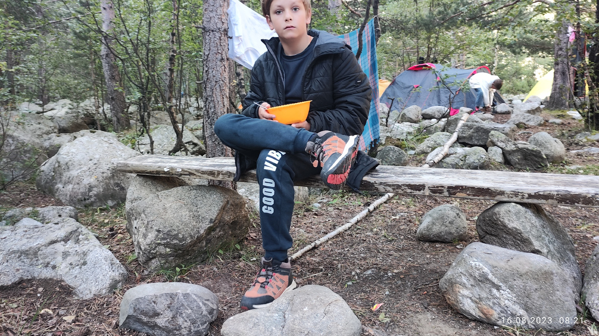 Сегодня был крайний день в лагере Уллутау и мы идём в ущелье Койавган. Отработанным вчера способом переправляемся через Адырсу и по широкой долине мимо вчерашней скальной лаборатории направляемся ко входу в ущелье. У подножия ущелья уютно притаился водопад, куда мы заглянем немного позже. Сейчас же нам предстоит очень серьёзный и крутой набор высоты: мы поднимемся вверх на 700 м к Койавганским ночёвкам посмотрим на то, что осталось от ледника и полюбуемся окружающими горами. До входа в ущелье -2км. Сказать, что подъем был крут, ничего не сказать: там надо просто пройти. За меньше чем 2 км набрать 700м по высоте-это прям круто-круто! Выйдя из зоны леса и пройдя по зоне альпийских лугов мы наконец, достигли плоской зеленой полянки, где дети остались отдыхать, а часть взрослых поднялись еще на 150 метров вверх к ночевкам. Ледник, как и в других местах уполз далеко в горы… Мы с ним так и не встретились. С красивых зелёных ночёвок ущелья можно было рассмотреть наш вчерашний путь и огромну