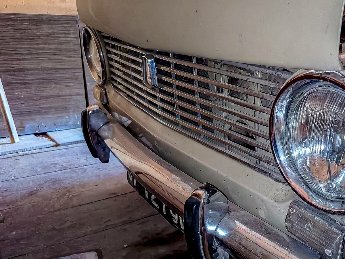 Представьте себе картину: тихий гаражный кооператив, полумрак, даже свет в гараж не проведен, запах пыли и, на удивление, довольно сухое помещение. Машина накрыта чехлом, который при нас же снимают. И вот она — «копейка»! Под небольшим слоем пыли угадываются знакомые формы, и родной цвет, который отдает глянцем. И, надо сказать, выглядит она для своих 47 лет довольно бодро.