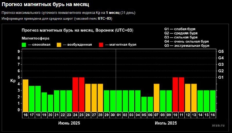 Магнитные бури вернутся в Воронежскую область в конце июня Во вторник и в среду, 24 и 25 июня, геомагнитная обстановка вновь ухудшится. Буря ожидается слабой — уровня G1. С повторной геомагнитной активностью воронежцам предстоит встретиться уже в середине грядущего месяца, 10 и 11 июля. Она также не превысит слабый класс G1. Затем буря временно утихнет. ⚡️Подпишись на «Медиа-Х Воронеж»