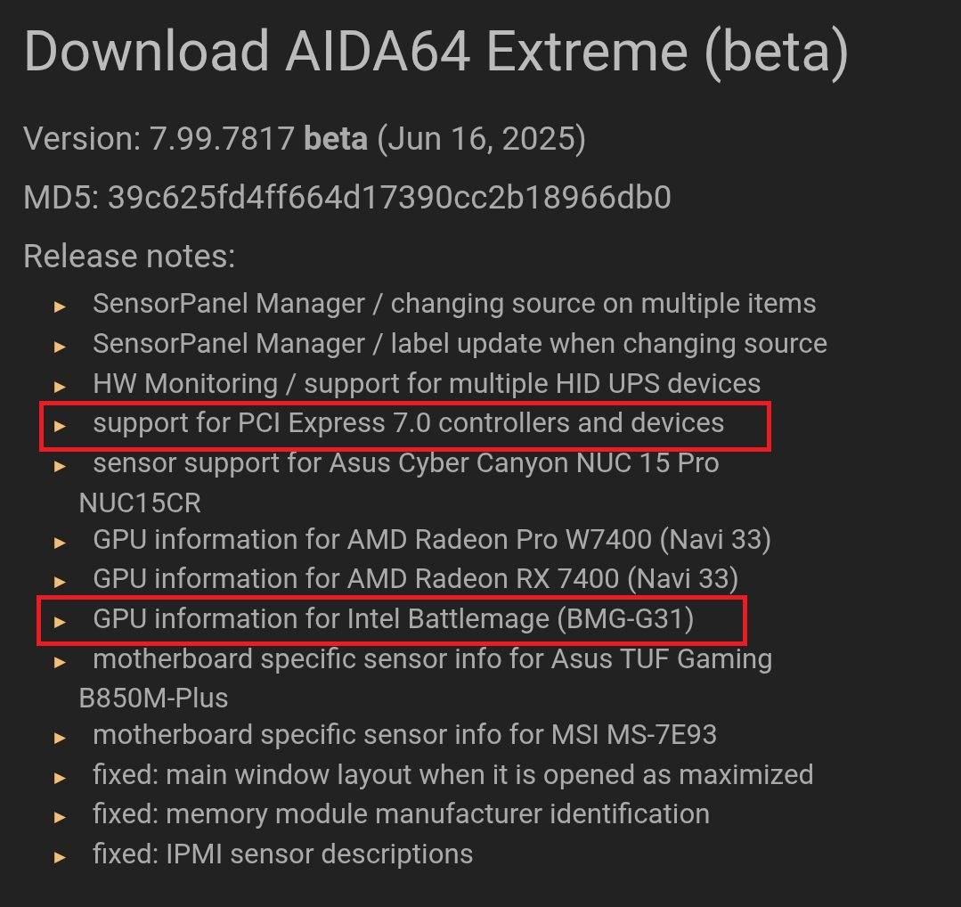 Поддержка графического процессора Intel BGM-G31 была добавлена в новую бета-версию AIDA64 (7.99.7817). По слухам, этот чип ляжет в основу будущей видеокарты ARC B770. По утечкам, BGM-G31 оснащён 32 ядрами Xe2, 256-битной шиной и PCIe 5.0 x16. Также в утилиту добавлена начальная поддержка устройств с интерфейсом PCIe 7.0.