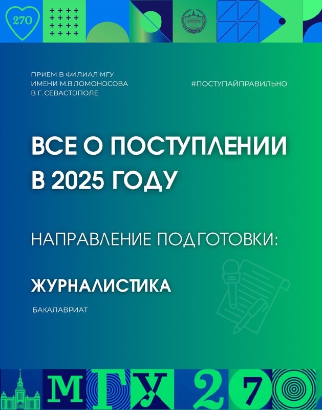 Абитуриенты 2025! На связи филиал МГУ имени М.В. Ломоносова в г. Севастополе! #поступайправильно Как поступить к нам на бакалавриат по направлению подготовки "Журналистика?" Ознакомьтесь с информацией, чтобы не упустить все самое важное! 🌎 Узнать больше можно на нашем сайте по активной ссылке ниже: https://sev.msu.ru/priemnaja-komissija/ 📞 Телефон приемной комиссии: +7 (8692) 48-92-78 ✉️ Электронная почта: pk@sev.msu.ru #новости_севмгу