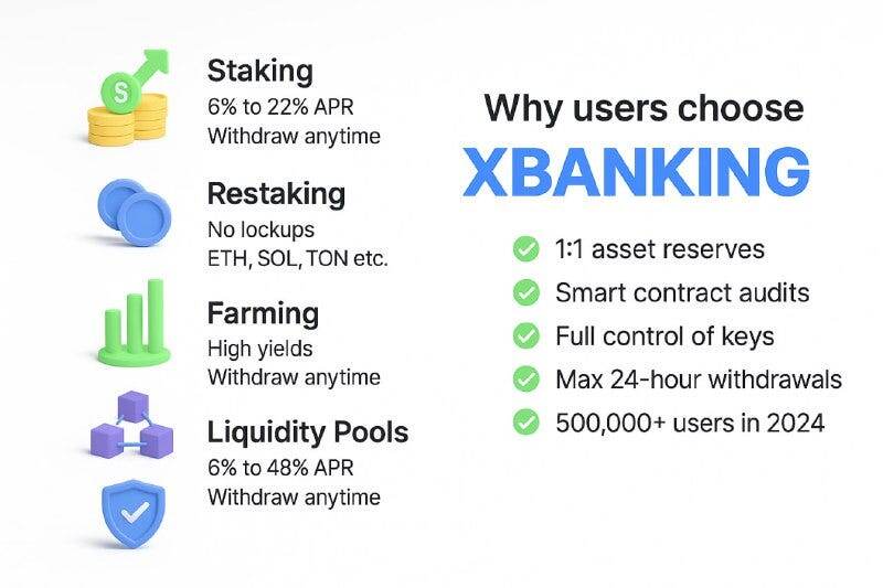 XBANKING — это универсальный агрегатор, который автоматизирует поиск лучших инвестиционных возможностей в DeFi. Вам больше не нужно тратить часы на анализ пулов — мы сделали это за вас! ✔ Полное резервирование 1:1
