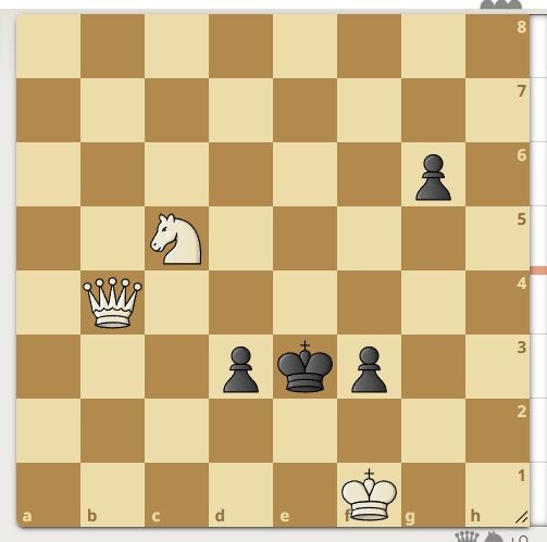 Автор задачи Е. Богданов, 2000 год. Черный король с тремя пешками. У белых конь и ферзь. Белые начинают и ставят мат в 2 хода. Поддержите автора. Первый верный ход в галерее. Более мощная задача тут >>>