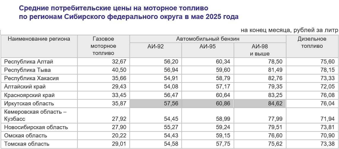 Среди регионов Сибирского федерального округа самые низкие цены на газовое моторное топливо и дизельное топливо оказались в Омской области, на автомобильный бензин марки АИ-92 и АИ-95 – в Алтайском крае, марки АИ-98 и выше – в Томской области. В мае 2025 года по сравнению с апрелем 2025 года индекс потребительских цен на моторное топливо в Новосибирской области составил 100,5%. Изменились цены на автомобильный бензин марок АИ-92 и АИ-95 (+0,6%), дизельное топливо (+0,3). Снизились цены на газовое моторное топливо (-1,2%). Цены на автомобильный бензин марки АИ-98 и выше остались без изменения. По данным Новосибирскстата, самый дорогой бензин – в Иркутской области. Топливо в этом регионе стоит 57,56 рублей – АИ-92, 60,86 – АИ — 95 и АИ-98 — 84,62. Здесь же зафиксировали одно из самых высоких по стоимости дизельное топливо в Сибири – 76,04 рубля. Чуть выше только цены на него в Красноярском крае.