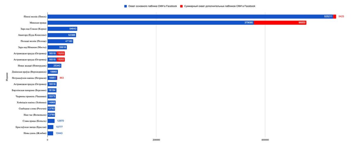 📌Наша группа в "Facebook" - на первом месте по охвату аудитории в республиканском рейтинге! Количество СМИ в исследовании – 98 Суммарное количество подписчиков – 286 тыс. Суммарный охват в месяц – 1 млн 650 тыс. ⚡️ЛИДЕРЫ По суммарному охвату 1️⃣Пінскі веснік (Пинск) 530636 2️⃣Минская правда 475945 3️⃣Зара над Сожам (Корма) 54643 4️⃣Авангард (Буда-Кошелево) 52388 5️⃣Полацкі веснік (Полоцк) 47160 Всю статистику смотрите здесь 📍📍@Пинский Вестник ЮТУБ | САЙТ| ИНСТ | ВК | ОК | ФЕ | Прислать новость