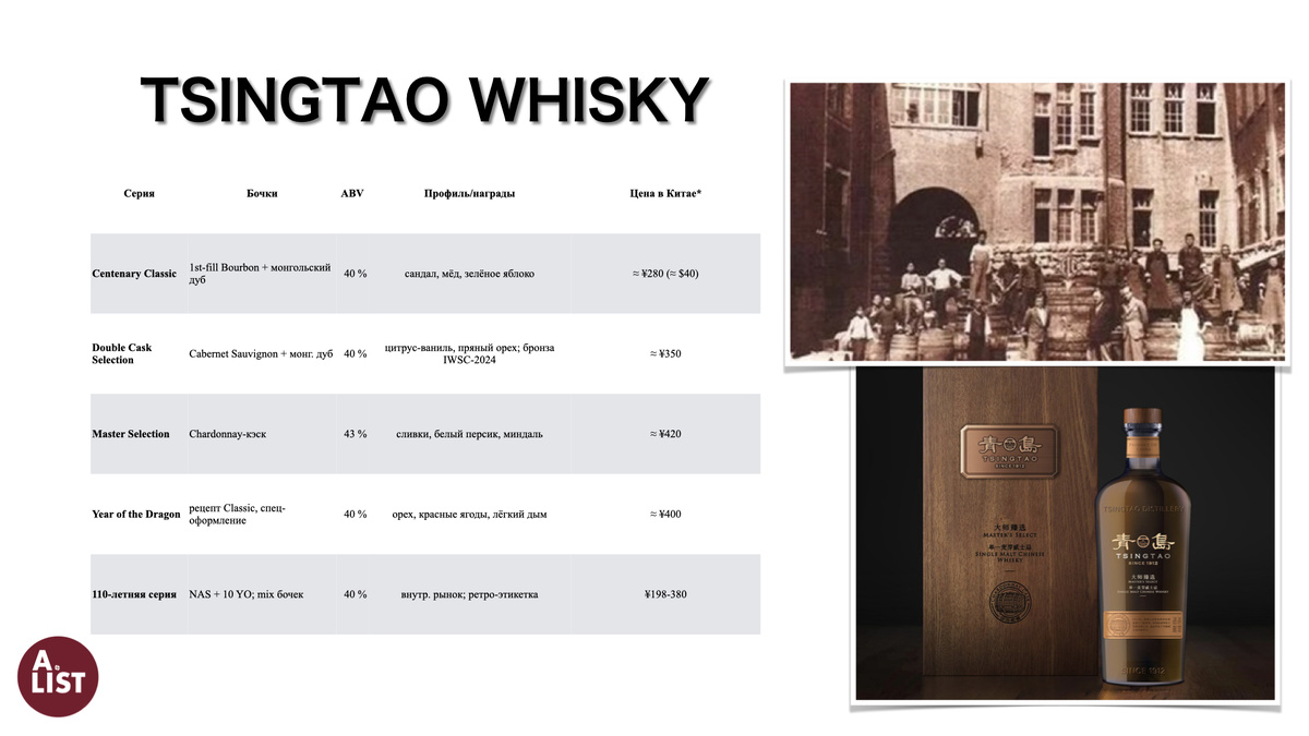 Его выгнали не японцы, а немецкий купец Макс Краук (Krauck, 克劳克): в 1912 г. он построил винокурню Meico/Tsingtao Winery в тогдашнем германском Циндао, а в 1914-м разлил первый китайский солодовый виски — за 9 лет до открытия японской Yamazaki! Краткая хроника Позиционирование и рынок Почему интересно следить за Tsingtao Whisky 🔗 Официальный сайт: https://www.tsingtaowhisky.com