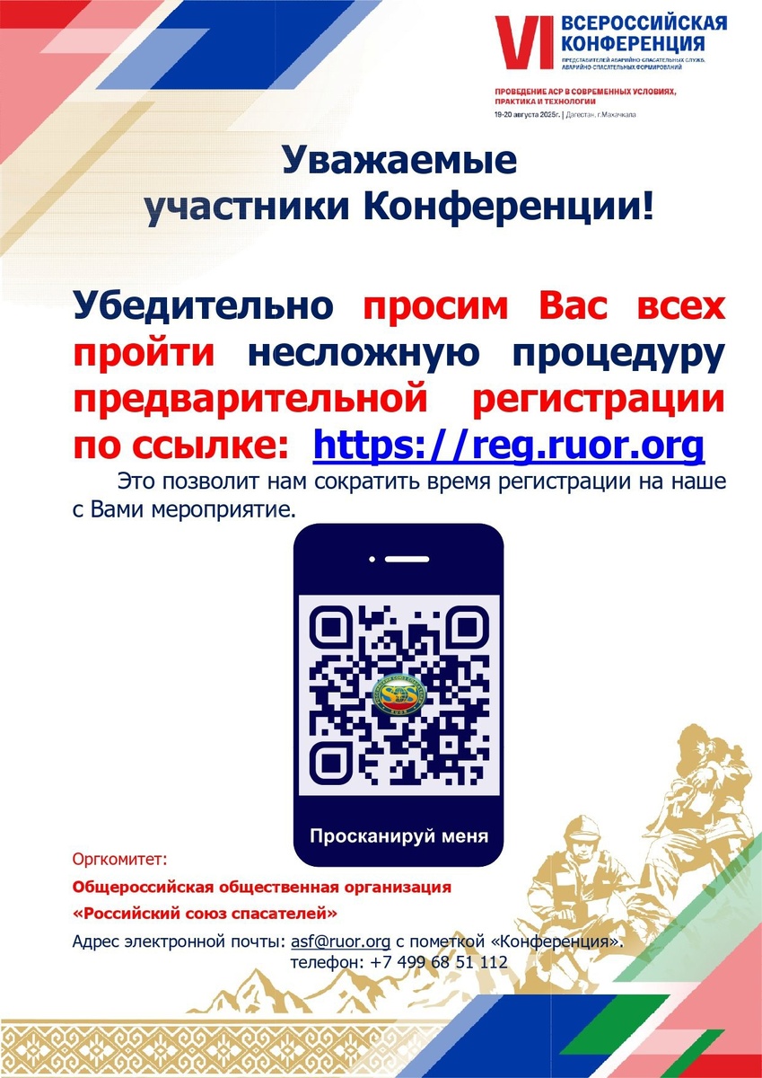 Открыта регистрация на VI ВСЕРОССИЙСКУЮ КОНФЕРЕНЦИЮ представителей аварийно-спасательных служб и формирований! Даты: 19-20 августа 2025 года Место: Дагестан, г. Махачкала Регистрация по ссылке: https://reg.ruor.org Обсудим современные условия АСР, новые практики и технологии.