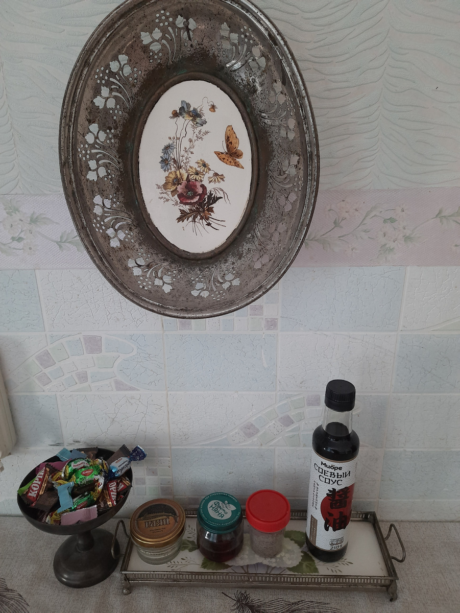 С утра наводила красоту на кухне. На столе у меня стоит старинный поднос, на котором всякие нужности: соль, перц, соусы, урбеч... Но выглядело это некрасиво: