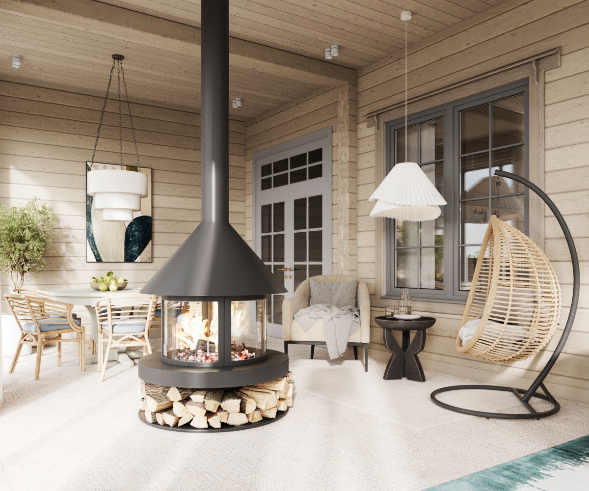 Лёгкие песочные тона, плетёное подвесное кресло-кокон, островной камин с живым огнём и запасом берёзовых поленьев — здесь хочется сидеть босиком, завернувшись в плед, и любоваться закатом. Окна отражают зелень участка, а в оформлении — натуральные материалы и светлый ротанг, чтобы сохранить воздушность пространства. С фронтальной стороны раздвижная конструкция позволит легко сделать террасу открытой.