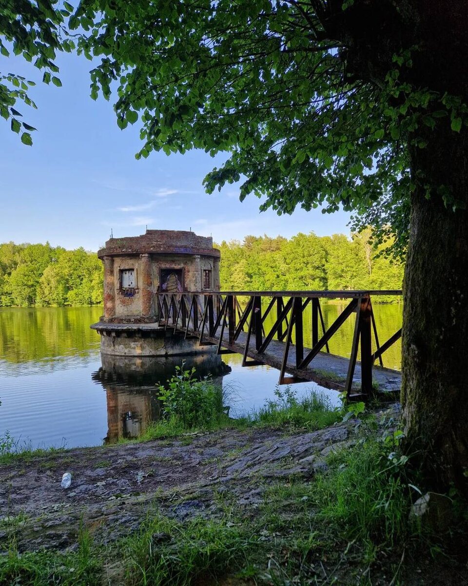 Башенка с затвором на пруду Великом в Колосовке. ⠀ Конструкцию возвели в конце XIX — начале XX веков. Её использовали для дренажной системы озера. Башенку соединяет с дамбой металлический мостик. ⠀ В 1990-е годы постройка утратила крышу. Сейчас находится в запустении. ⠀ Фото: @grishin.39