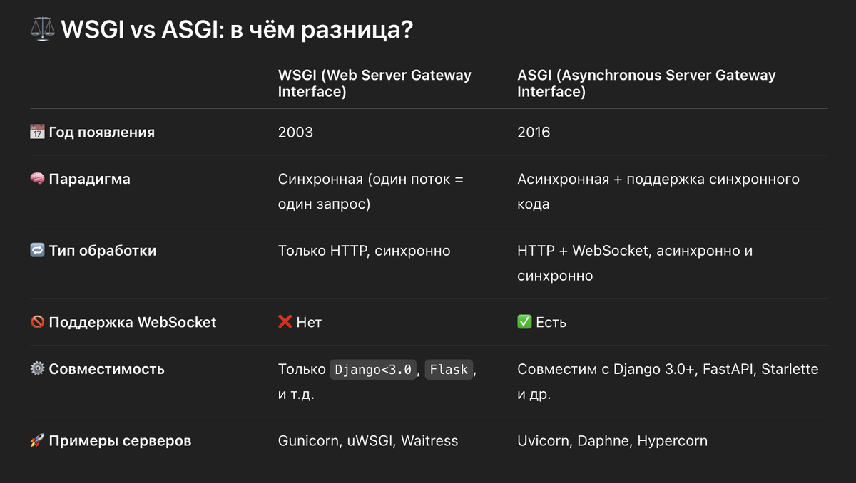 Главное: ASGI умеет одновременно обрабатывать много лёгких и долгоживущих соединений — идеально подходит для real-time приложений (чат, стрим, телеметрия, игры).