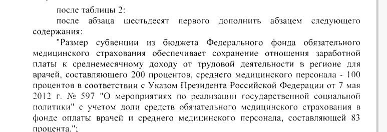 Как гласит документация, размер субвенции из бюджета Федерального фонда обязательного медицинского страхования обеспечивает сохранение отношения заработной платы к среднемесячному доходу от трудовой деятельности в регионе для врачей, составляющего 200 процентов, среднего медицинского персонала — 100 процентов в соответствии с Указом президента Российской Федерации.