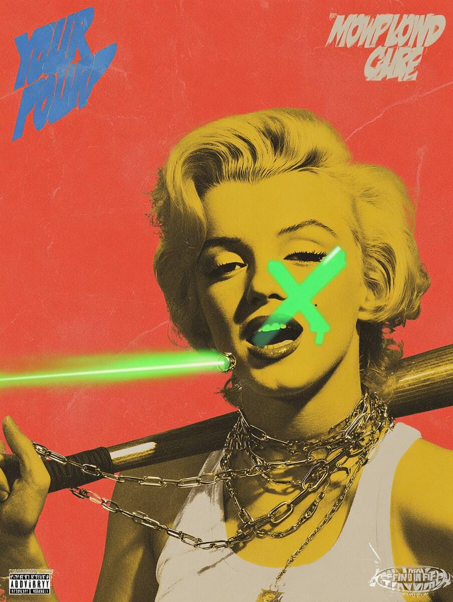 Marilyn Monroe with a baseball bat in his hand. her cheek is covered in neon green graffiti in the shape of an "x". she is wearing gold chains against a red background, in the style of a hip-hop album cover art portrait in the style of biopunk, photography, front view --chaos 50 --ar 3:4 --style raw --v 7 --stylize 500 --weird 700