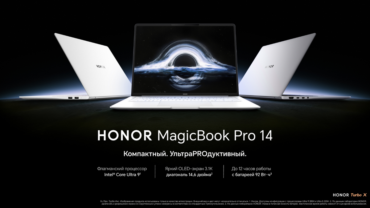 Тонкий и легкий ноутбук оснащен флагманским процессором последнего поколения, сенсорным OLED-экраном с диагональю 14,6 дюймов. Ключевой особенностью стала батарея высокой емкости 92 Вт·ч и новая AI-технология оптимизации энергопотребления HONOR Turbo X.