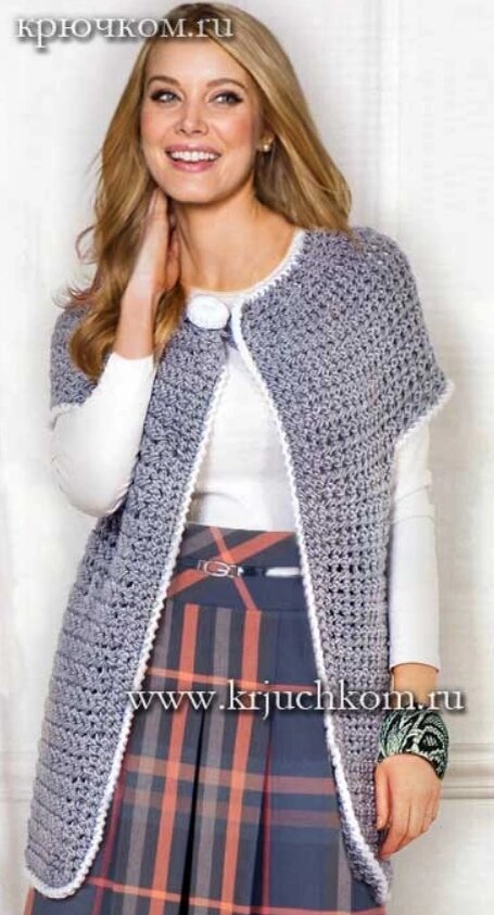 Рада приветствовать всех на своем канале! Сегодня хочу поделиться с вами подборкой идей длинных жилетов крючком. ⚡Длинный жилет крючком, размер: 46 - 48⚡ Вязаный жилет связан крючком сверху единым полотном. Длинный фасон жилета отлично подходит для полных женщин. Прямой покрой придает модели непринужденный характер и стройнит. ПОТРЕБУЕТСЯ: - 500 г пряжи NAKO «ARCTIC» (40 % шерсти, 60 % акрила; 100 м/100 г); из них: - 450 г серого цвета; - 50 г белого цвета; - крючок № 10. ОПИСАНИЕ ВЯЗАНИЯ Основной узор - ст. б/н. Плотность вязания, основной узор: 7,5 п. и 9 р. = 10 х 10 см. Цельновязанные правая полочка, правый рукав, спинка, левый рукав и левая полочка жилета. Вязать сверху вниз, прямыми и обратными рядами. Пряжей серого цвета крючком № 10 набрать цепочку из 36 возд. п. (35 возд. п. основы + 1 возд. п. подъёма). 1-й ряд: 1 ст. б/н в 3-ю возд. п. цепочки от крючка, 33 ст. б/н в следующие 33 возд. п. основания цепочки. 2-й - 4-й ряды: 1 возд. п. подъёма, 34 ст. б/