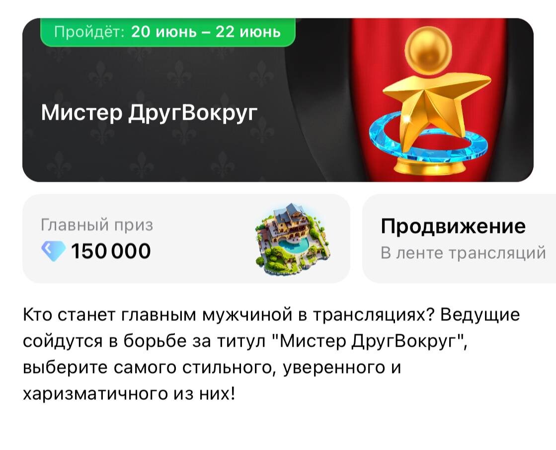 Докажите, что именно вы самый главный и харизматичный ведущий в ДругВокруг! Проявите себя, завоюйте симпатии зрителей и ворвитесь в топ!