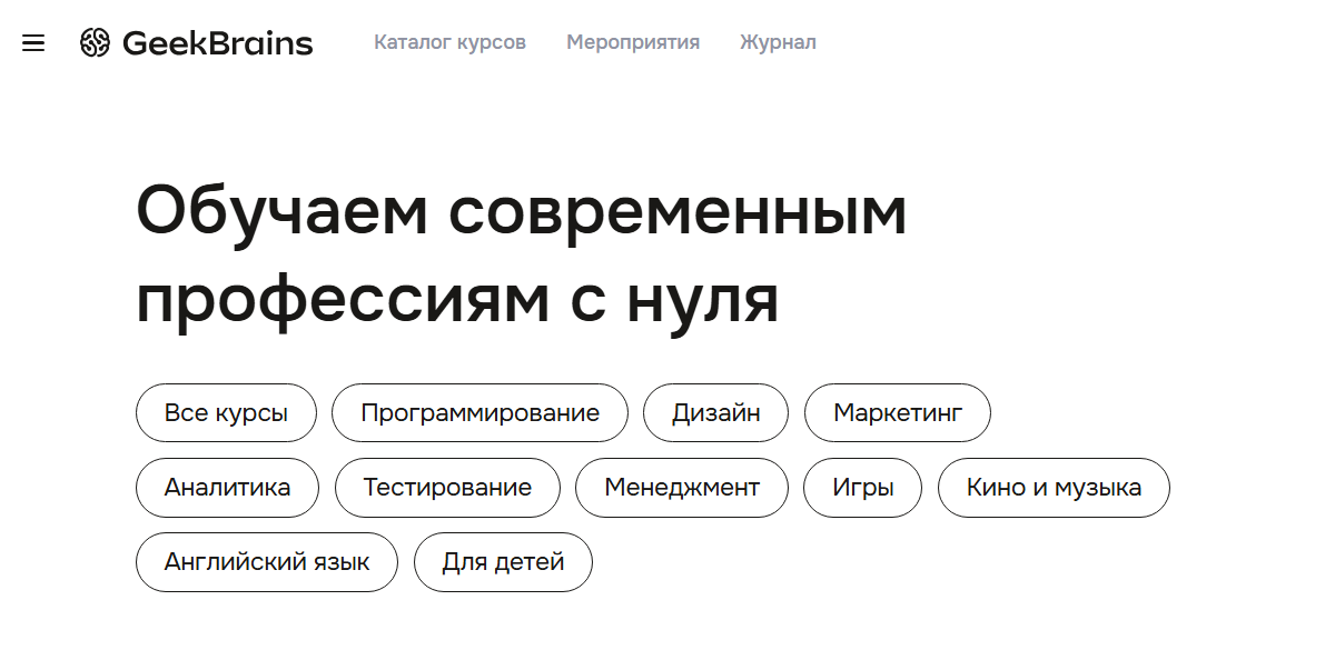 Учебный каталог Geekbrains представлен направлениями: программирование, веб-дизайн, аналитика данных, маркетинг и разработка мобильных приложений. Курсы рассчитаны как на начинающих, так и на опытных специалистов. Формат обучения — видеолекции с заданиями и обратной связью наставников. Время обучения варьируется от 1 до 12 месяцев. Стоимость курсов составляет от 15 000 до 70 000 рублей, в зависимости от направления и глубины программы.