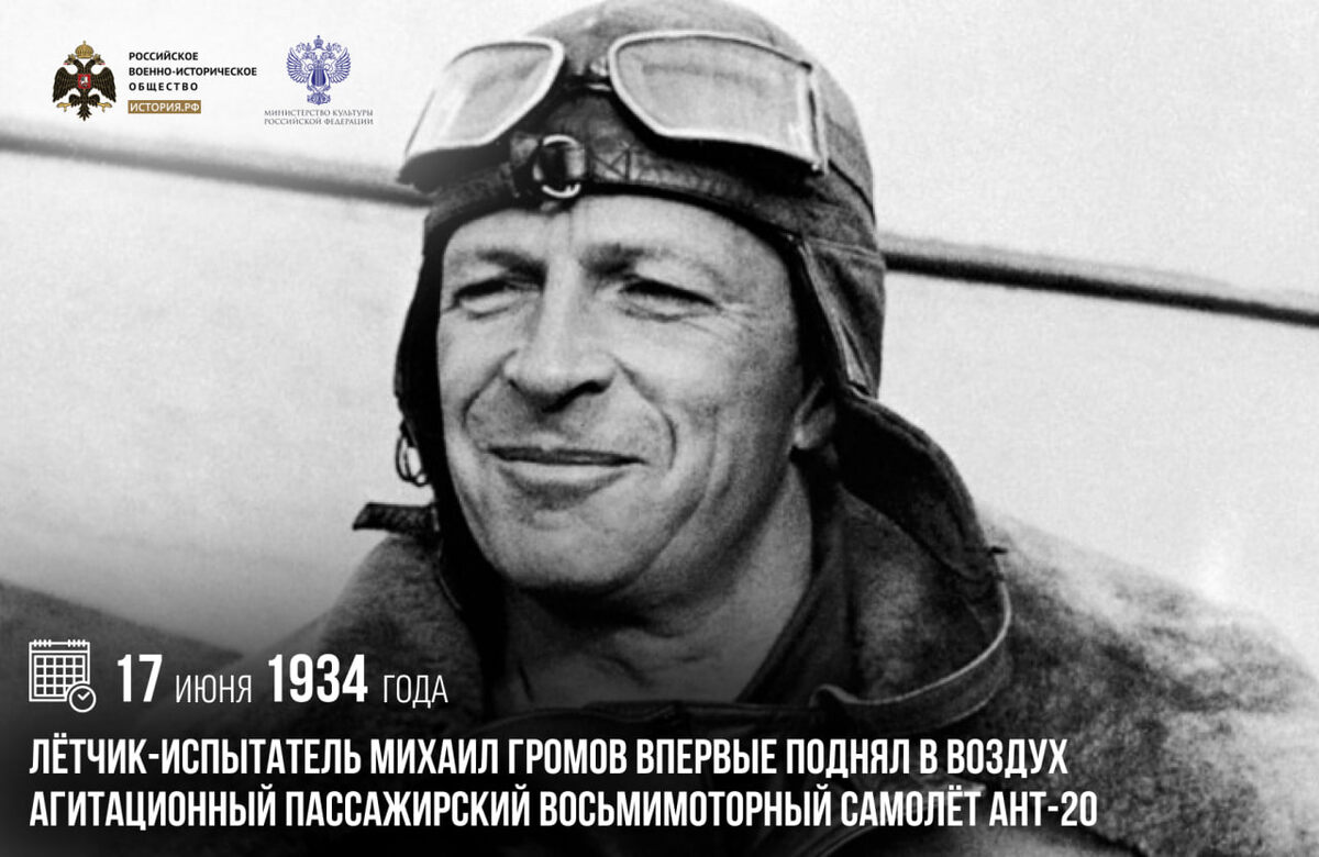 17 июня 1934 года летчик-испытатель Михаил Громов впервые поднял в воздух агитационный пассажирский восьмимоторный самолет АНТ-20