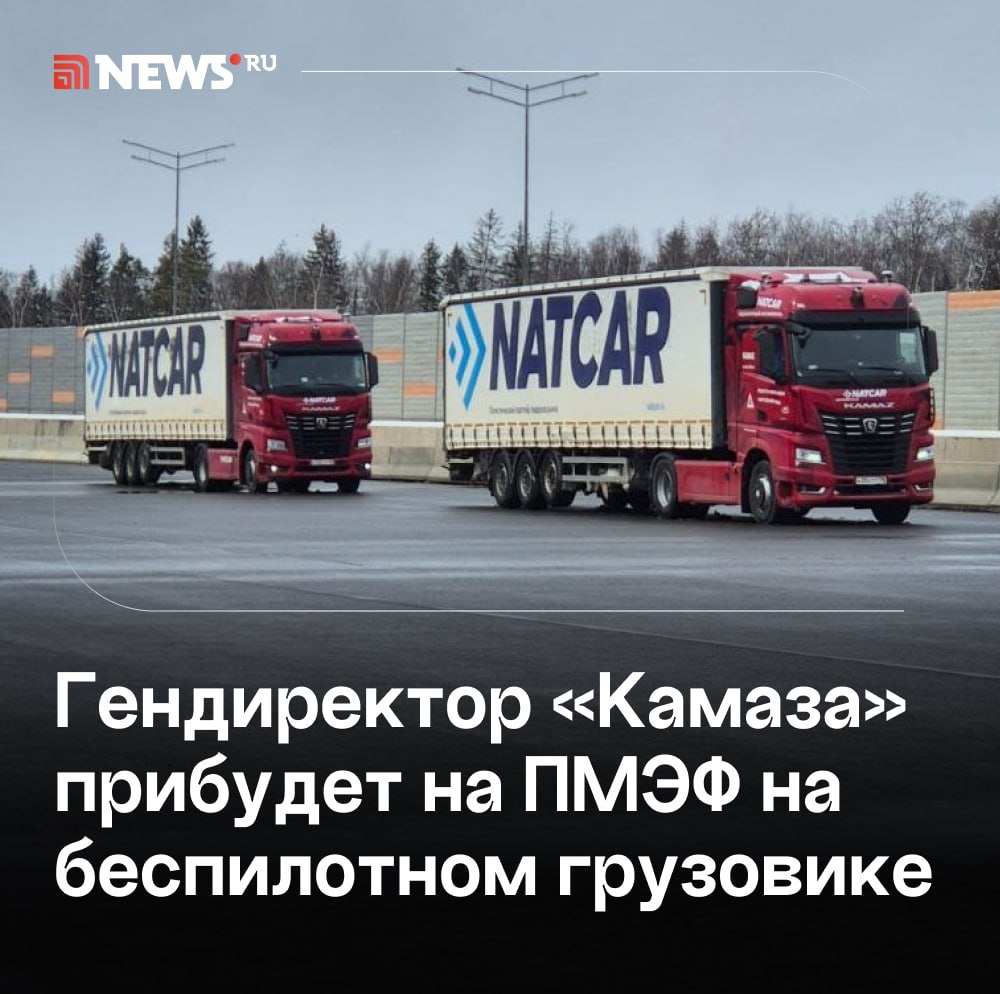 Эффектное появление: глава «Камаза» Когогин приедет завтра на ПМЭФ на беспилотном грузовике «Маяк-2». Маршрут будет проложен по трассе М-11 «Нева», сообщили в компании. ⭕️ Подписаться | Прислать новость | Буст