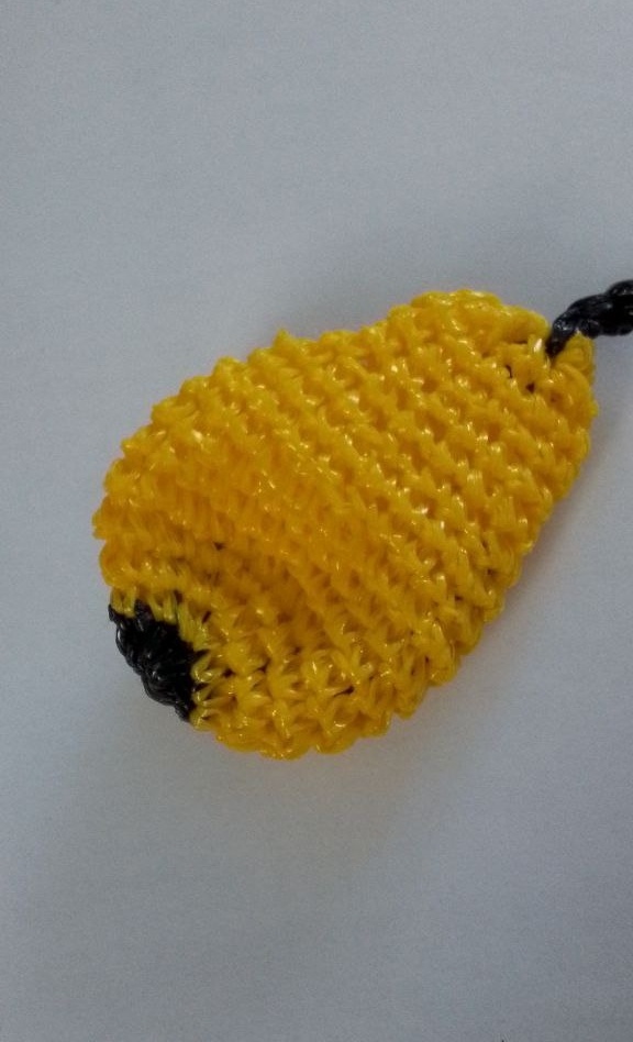 Мини груша Набрать черным цветом 12 ст БН в кольцо амигуруми далее вяжем ст бн Перейти на жёлтый цвет 2р 1ст,2ст в один*18 3р 2ст БН,2в один*24 4р 3ст БН,2в один*30 5-9р30 ст БН 10р 3ст БН,2вместе*24 11р 24ст бн 12р 2ст бн,2вместе*18 13р-15р 18ст БН 16р 1ст БН,2вместе*12 17р 2ст БН вместе* 18р нить стянуть Связать кончик черной нитью набрать возд цепочку из 6 петель и провязать 1 ряд ст бн Нить закрепить,кончик спрятать.