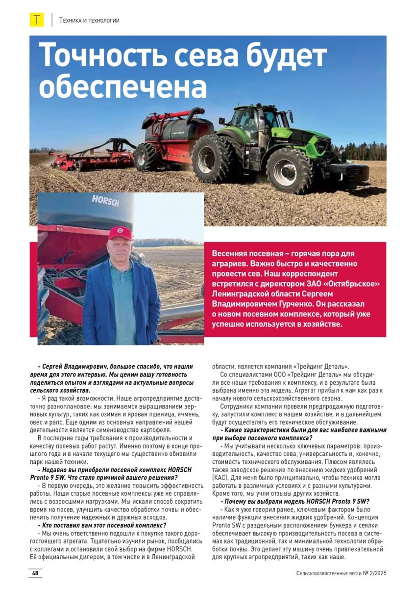 Точность прежде всего! Директор ЗАО «Октябрьское» Ленинградской области Сергей Владимирович Гурченко рассказал о новом посевном комплексе HORSCH Pronto 9 SW, который успешно используется в хозяйстве. Выбор комплекса HORSCH Pronto 9 SW был обусловлен его способностью повышать эффективность работы. Важными характеристиками стали производительность, качество сева, универсальность, стоимость обслуживания и наличие функции внесения жидких удобрений (КАС). Первые впечатления от работы с HORSCH Pronto 9 SW положительные, что вселяет надежду на высокий урожай. Подробнее: https://agri-news.ru/zhurnal/2025/2-2025/tochnost-seva-budet-obespechena/ #АПК #АПКЛО #ЗАООктябрьское #ТрейдингДеталь