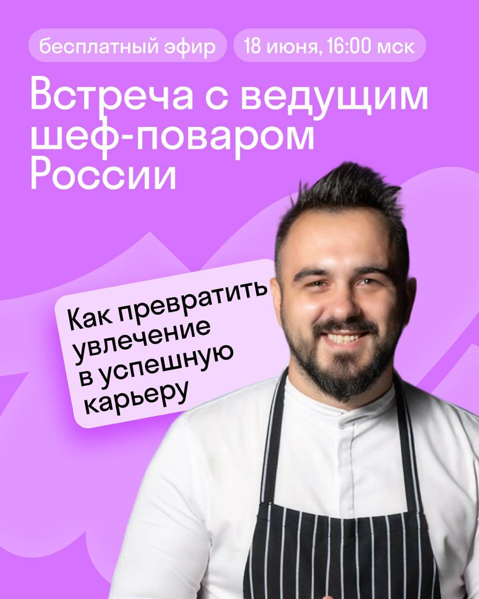 Домашний лицей Skysmart приглашает на открытую встречу с одним из ведущих шеф-поваров России — Валерием Егорцовым. Заглянем на настоящую профессиональную кухню и узнаем, как рождаются авторские блюда, как выглядит работа в ресторане изнутри и почему навыки шефа важны в любой профессии. 👩🍳 Для детей это шанс вдохновиться и увидеть, как интерес превращается в карьеру. 👨👩👦 А родителям будет полезно узнать, какие навыки формируются в таких творческих профессиях и чем они полезны ребёнку в будущем — даже если он не станет поваром. Поговорим о важности поддержки, свободе пробовать и борьбе со страхами при поиске своего пути. 🗓 Когда: 18 июня (среда), 16:00 мск. 📌 Где: онлайн. 📲 Ссылку на эфир опубликуем в нашем телеграм-боте. Встреча пройдёт в рамках Домашнего лицея Skysmart — проекта, который помогает школьникам не просто учиться, а развиваться, искать себя и понимать, кем хочется стать в будущем. 👉 Перейти в телеграм-бот 👈