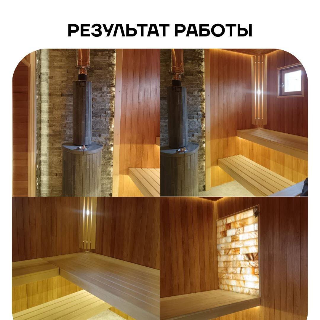 Установили панно из можжевельника — создает неповторимую атмосферу: наполняет парную целебным ароматом, а вместе с вставками из гималайской соли — благотворно влияет на дыхательную систему.