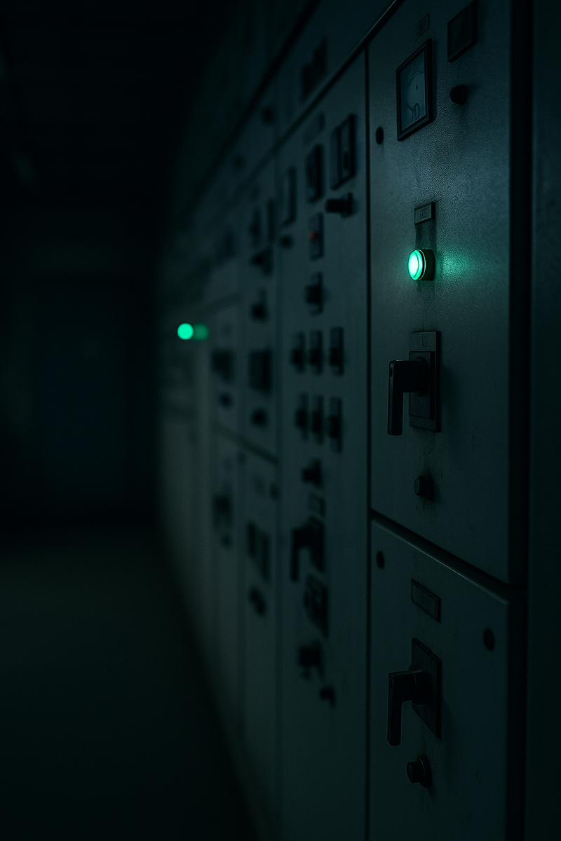 Зелёные огоньки мигают спокойно. В щите — ни одного предупреждения. В коридоре — пусто, гул трансформатора за стенкой звучит ровно, как фон.