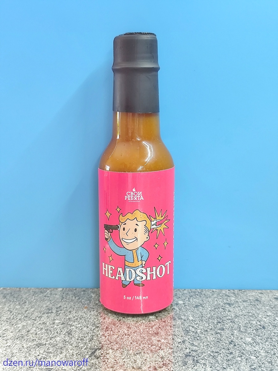 Прикупил по случаю на Озоне три острых соуса от неизвестного мне красноярского производителя "Свои ребята". Как подсказывают эти ваши интернеты, по адресу, напечатанному на бутылочках, в Красноярске находится одноименный стейкхаус. Видимо, решили под свои стейки замутить линейку острых соусов, а излишки продать. Ну и начнем мы с самого слабоострого соуса под названием Headshot. Слабоострый он, конечно же, для истинных огнеедов, ибо в нем обещана целая сотня тысяч Сковиллов (напомню, что в классическом Табаско всего 2500-5000 SHU). Почитаем описание: Эвридэй соус для всех случаев жизни Соус хорош везде в разных пропорциях, иногда достаточно пары капель для интересного вкуса и аромата, а порой хочется залить им всё блюдо, чтобы проверить себя. Он подойдет для любых видов мяса, салатов, супов, и особенно оху…хорошо использовать его для маринадов. Соус все делает вкуснее. Состав: Соус достаточно жиденький, а бутылочка без дозатора, с широким горлышком, так что передоз устроить довольно