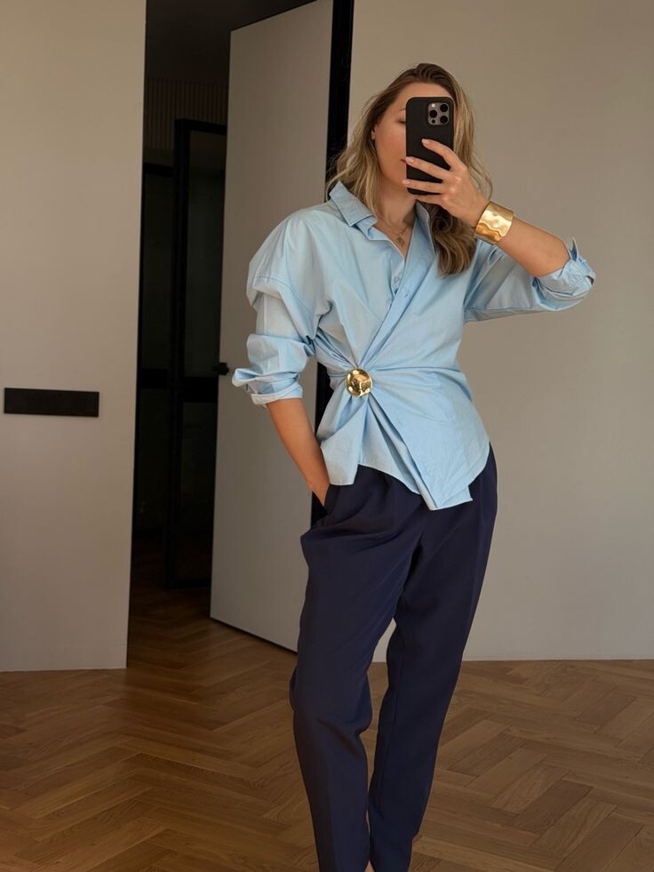 Рубашка — это не просто базовая вещь, это холст для стиля. Она умеет меняться вместе с вами, подстраиваться под настроение, быть дерзкой, романтичной, деловой и расслабленной. В 2025 году мы не просто носим рубашки — мы выбираем образы с "изюминкой". Сегодня в статье 12 способов носить рубашку так, чтобы каждый образ был про вас. Это вечная классика, но с нюансами. Заправьте рубашку полностью, добавьте тонкий ремень, и получите утонченный образ, который подходит для офиса и не только. Хотите остроты? Подкатайте рукава и добавьте цепочку на шею. Свободные, струящиеся брюки-палаццо идеально сочетаются с легкой рубашкой из вискозы или шелка. Заправьте полностью или только спереди, добавьте широкий ремень — и вот вы уже на итальянском побережье, даже если идете за кофе. Кюлоты и рубашка — пара для тех, кто любит архитектурные силуэты. Завяжите рубашку узлом на талии, чтобы подчеркнуть линию бедер. Или создайте образ в духе «умного кэжуал», заправив рубашку частично. Самый универсальный дуэ