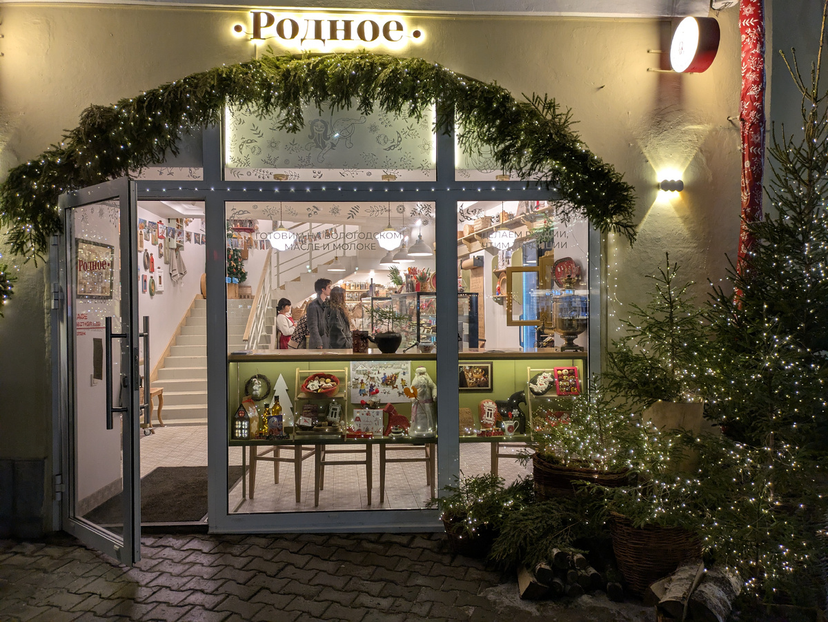 На пешеходной улице Каменный мост в Вологде есть прикольный магазинчик. Называется "Родное". Вывеска у него заметная, а ещё из магазинчика доносятся то песни, то сказки с вологодским оканьем. Не знаю, как вам такое, может для кого-то это звуковой шум, но мне атмосферит. Смотрите, как здорово вход был украшен зимой! Впрочем, летом тоже мило выглядит. Так вот, на кой вам этот магазинчик вообще. А там можно купить сладости на знаменитом вологодском масле. Я очень люблю у них помадки. Ещё в ассортименте есть пряники с изображением резных вологодских домиков и другие прикольные штуки. От пряников я в абсолютном восторге. Кажется, что масла при приготовлении положили прямо от души. Пряники абсолютно не сухие. Впрочем, на случай оказии на упаковке заботливо по писали совет: "Если пряничек стал сухим (так часто случается зимой из-за отопления), положите его на ночь в пакет с кусочком белого хлеба. Пряностей тоже не жалеют в тесто, вкус получается очень яркий. А на втором этаже кафе, в котором