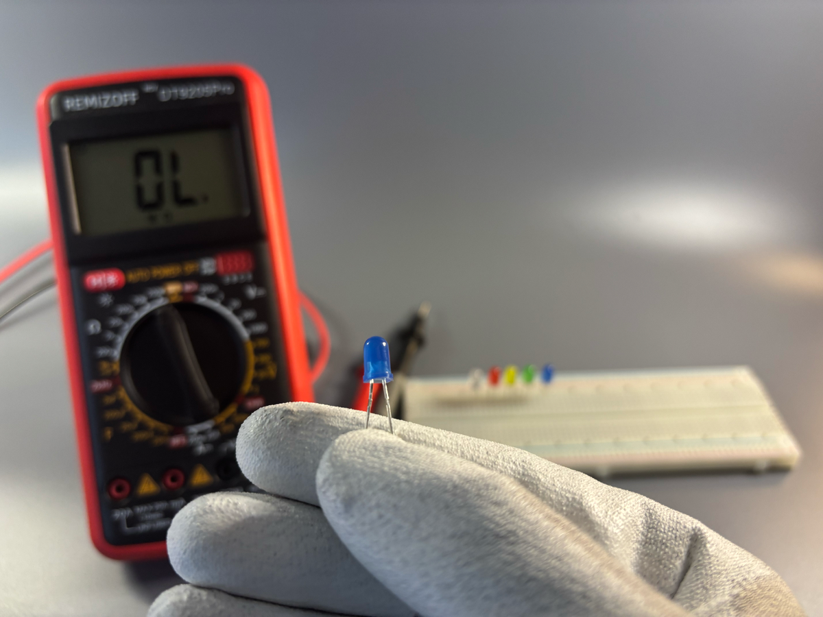 В этой статье я покажу вам, как можно проверить работу светодиода. Первое, что вам нужно сделать - это подключить черный щуп к COM порту Подключите красный щуп к порту напряжения и сопротивления На мультиметре проверните ручку настройки в положение с символами диода и непрерывности. Светодиод - это светоизлучающий диод, полупроводниковый прибор, который излучает свет при прохождении через него электрического тока. Положительная сторона называется анодом и имеет более длинный вывод. Отрицательная сторона называется катодом и имееет более короткий вывод. Подключите светодиод к макетной плате. Прикостнитесь красным щупом к аноду, а черным щупом - к катоду. Если светодиод исправен, мультиметр должен показывать падение напряжения примерно на 1,5-2 В. Светодиод также должен загореться. Возьмем еще один такой же красный светодиод. Мы видим, что "OL" отображается как для прямого напряжения, так и для обратного напряжения. Это указывает на неисправный светодиод. Желтый светодиод имеет напряж