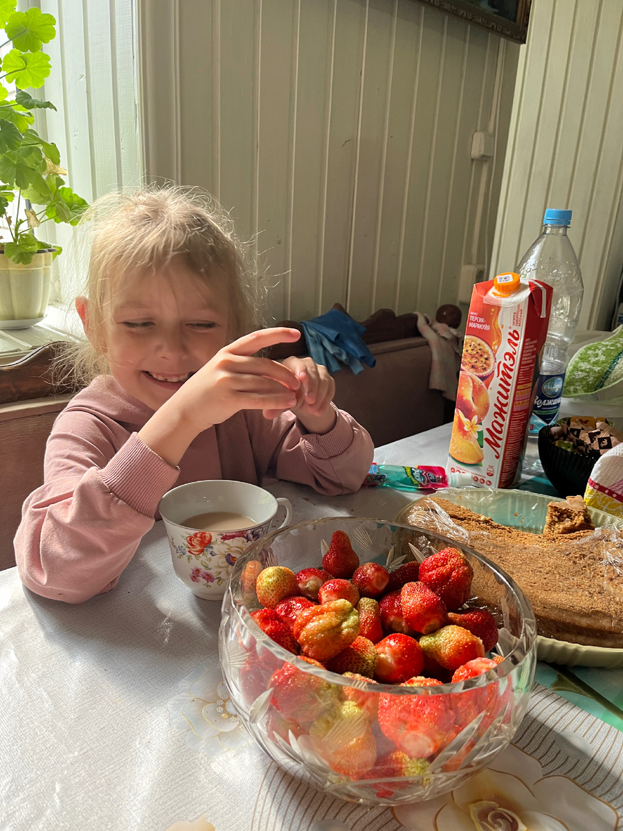 И медовик! Тоже местного производства! Во рту тающий! А с молоком- ягоды!