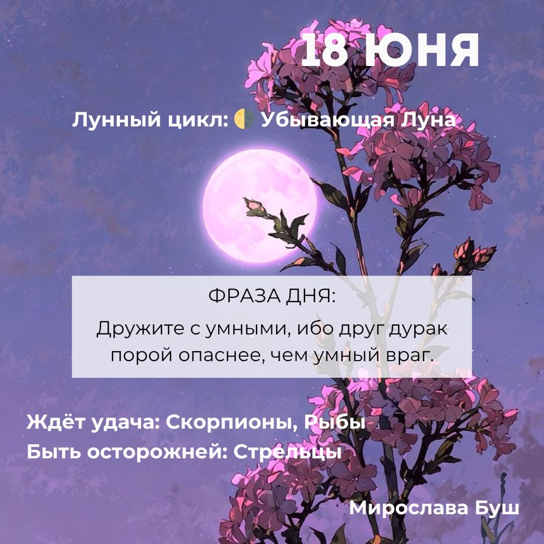 18 июня РЕКОМЕНДАЦИИ: ⚠️ Не трогайте старое! Не листайте фото бывших. Не читайте переписки. Не открывайте письма, на которые не отвечали месяц. Иначе получите упадок сил и ссоры. 💭 Лягте спать до полуночи. После 00:00 входить в сон опасно — потянет в чужие сны. Вам туда не надо. Завтрашний день требует раннего отключения. ❗️ Завтра хоть раз обязательно скажите НЕТ. Твердо. Первое, на что не хочется соглашаться — отказывайтесь. Через это к Вам пойдёт энергия. Промолчите — отдадите силу. ✉️ Подписаться на Мирославу #прогнознадень
