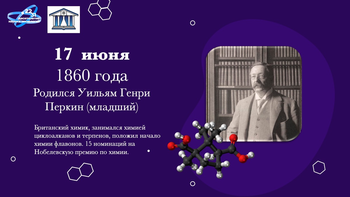 165 лет назад, 17 июня 1860 года в Садбери (Мидлсекс, Великобритания) родился Уильям Генри Перкин (младший) (1860-1929). Приставка «младший» говорит о том, что отец нашего героя, Уильям Генри Перкин-старший тоже чем-то был знаменит. И это так - в истории химии Уильям Генри Перкин-старший остался как основоположник химии синтетических красителей. Но сын, который пошел по стопам отца, не посрамил выдающегося родителя. Под руководством Байера синтезировал производные циклопропана и циклобутана, показав, что циклические соединения могут быть не только пяти- и шестичленными, создал методы синтеза полиметиленовых соединений на основе ацетоуксусного, бензоилуксусного и малонового эфиров, синтезировал цис- и транс-циклогександикарбоновые кислоты, изучал терпены, положил начало химии флавонов. А еще в активе ученого - 15 номинаций на Нобелевскую премию по химии (1911-1929 год). Увы, не сложилось, что никак не умаляет уровня нашего сегодняшнего именинника. #деньвисториихимии Материал подготовл