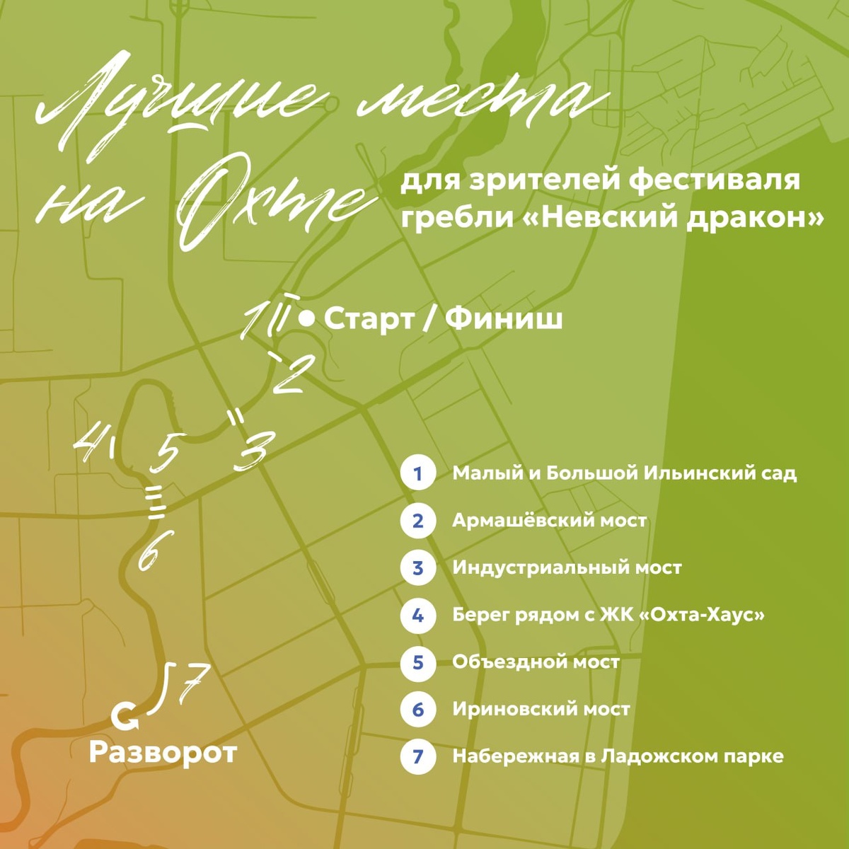 👀 Делимся картой с лучшими местами на Охте, где в эту субботу можно посмотреть гребной фестиваль «Невский дракон»
