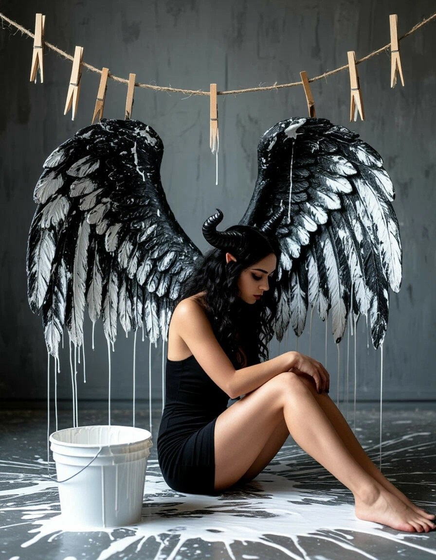 Крылышки и рожки могут быть интересней, чем очередное сюси-пуси. botanical, professional foto in profile, gray room, macro shot, huge black and white angel wings with spots of white paint hanging on clothespins on a rope in the room, white paint leaks and drips on the floor, drops of paint, next to sitting in profile view succubus woman with demon horns, head down in profile, sad, black very long wavy hair, black mini, bare feet, bucket with white paint on the floor #neuroart #нейроарт #ai #ии #нейросеть #картинки #искусственныйинтеллект #цифровоеискусство #digitalart #арт #art #prompt #промпт #подсказка