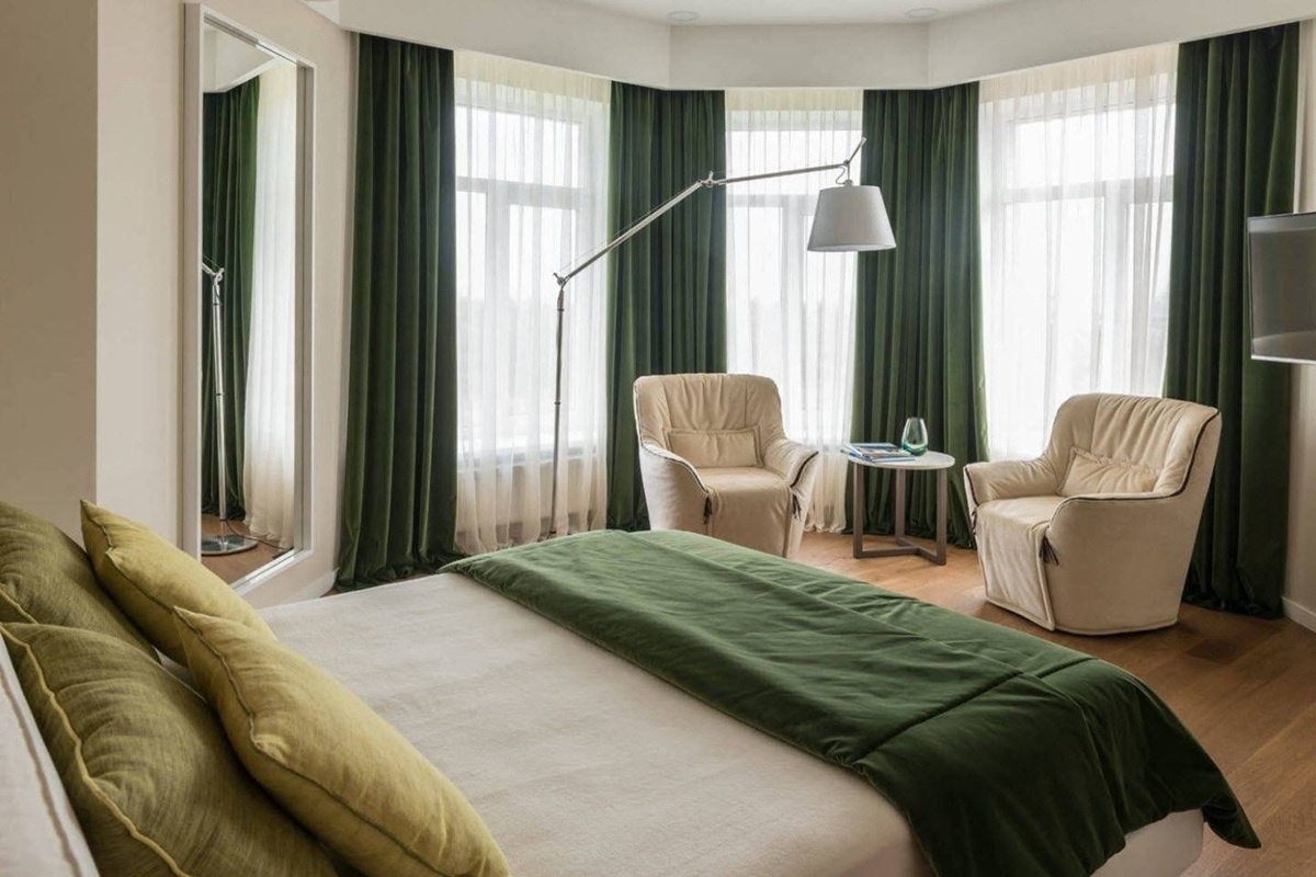 Зелёные шторы — стильный вариант для оформления апартаментов. Они обязательно добавят квартире уюта и напомнят о тёплом лете.