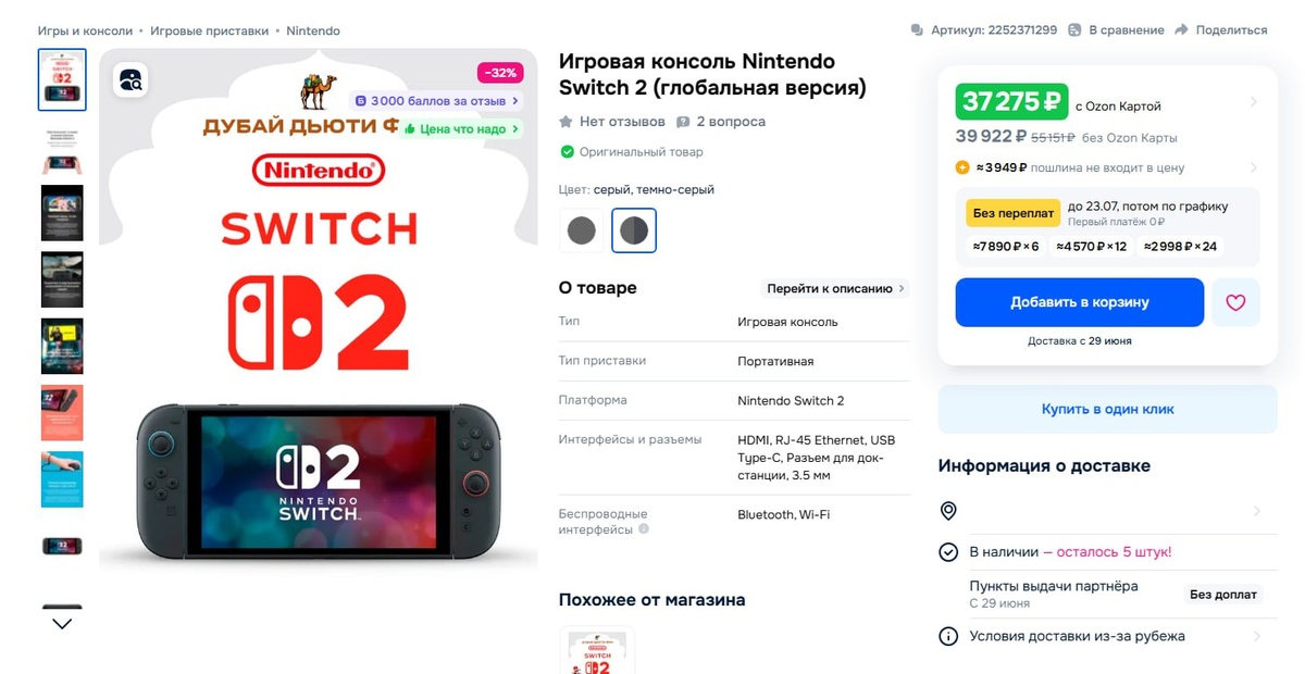 В ответ на пост Раскупили Если что 2, на Ozon появились дубайские Switch 2 по ещё более сладким ценам: • без Mario Kart — 41 224 с пошлиной • с Mario Kart — 44 829 с пошлиной Доставку обещают к концу месяца. Я не заказывал у них через Дубай, но цены сладкие, у продавца вроде всё хорошо с отзывами.