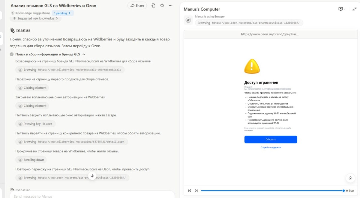 Наконец, дошли руки протестировать Manus — китайский AI-агент, который умеет работать с веб-браузингом. Поделюсь первыми впечатлениями. Попробовал на двух задачах: 1) Поиск маркетинговых референсов Результат реально крутой — точность выполнения задачи примерно 95%. Сходу нашёл кейсы и примеры реализации, уровень примерно как у OpenAI при Deep research 2) Сбор отзывов и инсайтов о продукте с маркетплейсов (Ozon и WB) А вот тут уже было не так гладко. Manus сначала не смог разобраться, как собирать отзывы на Wildberries. После детальной инструкции смог зайти на WB и собрать часть данных, но затем уткнулся в необходимость авторизации. На Ozon ситуация оказалась ещё хуже — бот сразу споткнулся о блокировку по VPN. А так думаю веб-браузинг агентами - годно, позитивно