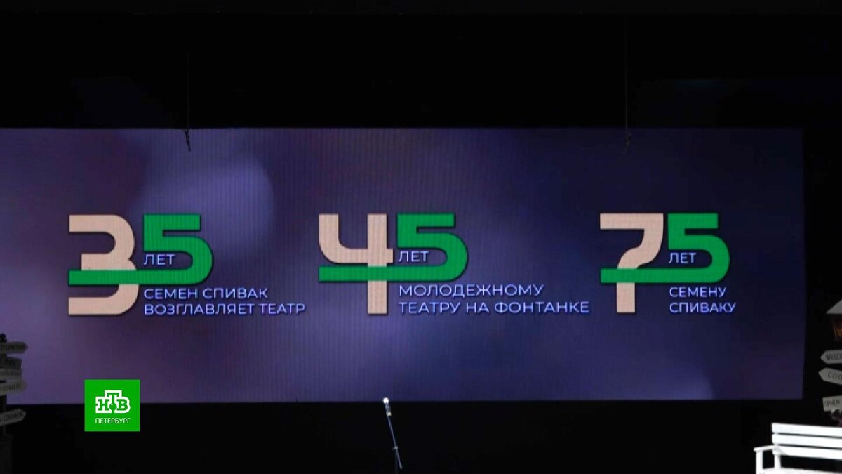 [ Смотреть видео на сайте НТВ ] В Молодежном театре на Фонтанке складывали цифры. 35 лет творческой деятельности Семёна Спивака, 45 лет театру и 75 лет художественному руководителю. В выходной день от спектаклей на основную сцену вышел весь коллектив, но сначала артистов, костюмеров, осветителей, звукорежиссеров и всех, кто создает постановки, поздравляли коллеги по театральному цеху. Художественные руководители «Зазеркалья» и «Санкт-Петербург Оперы» Александр Петров и Юрий Александров прислали видеооткрытки, а Сергей Паршин произнес теплые слова лично. Председателю Союза театральных деятелей Петербурга компанию составила актриса и депутат ЗакСа Анастасия Мельникова. Народный артист вспомнил табличку, когда-то висевшую на здании детской больницы на Васильевском острове. Сергей Паршин, народный артист России, председатель правления петербургского отделения СТД России: «Там было написано „Больница гуманного отношения к ребенку“. Но ее сейчас нет. Семён Яковлевич, ваш театр — это театр гу