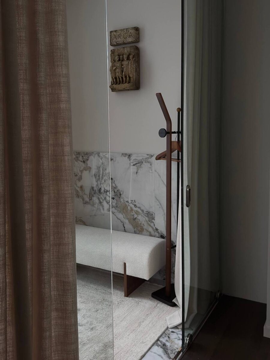 Стройка / реализация интерьера ателье ARCA Скоро состоится съемка нашего проекта, а пока давайте вспомним, с чего все начиналось. Когда мы только зашли в помещение, сразу стало ясно: интерьер не должен спорить с панорамным видом на Москву. Задача была разместить всё необходимое и сохранить ощущение воздуха. Мы оттолкнулись от логотипа ателье и использовали арочные формы, они повторяются в мебели и светильниках, добавляя пространству ритмичности и плавности одновременно. Рейлы для одежды ручной работы от Алексея Иншакова создали код пространства: прозрачное «воздушное» стекло и гравировка логотипа на крепеже. Эта деталь почти незаметна, но важна. Мы определили, что дерево рейлов должно быть темным, чтобы они визуально «исчезли» на фоне рам окон. Ателье — это про качественные ткани, про комфорт и тактильно приятные ощущения, которые испытывает клиент, заказывая новый костюм. Это мы постарались передать в интерьере, уделив особое внимание материалам и текстилю: натуральное дерево, л