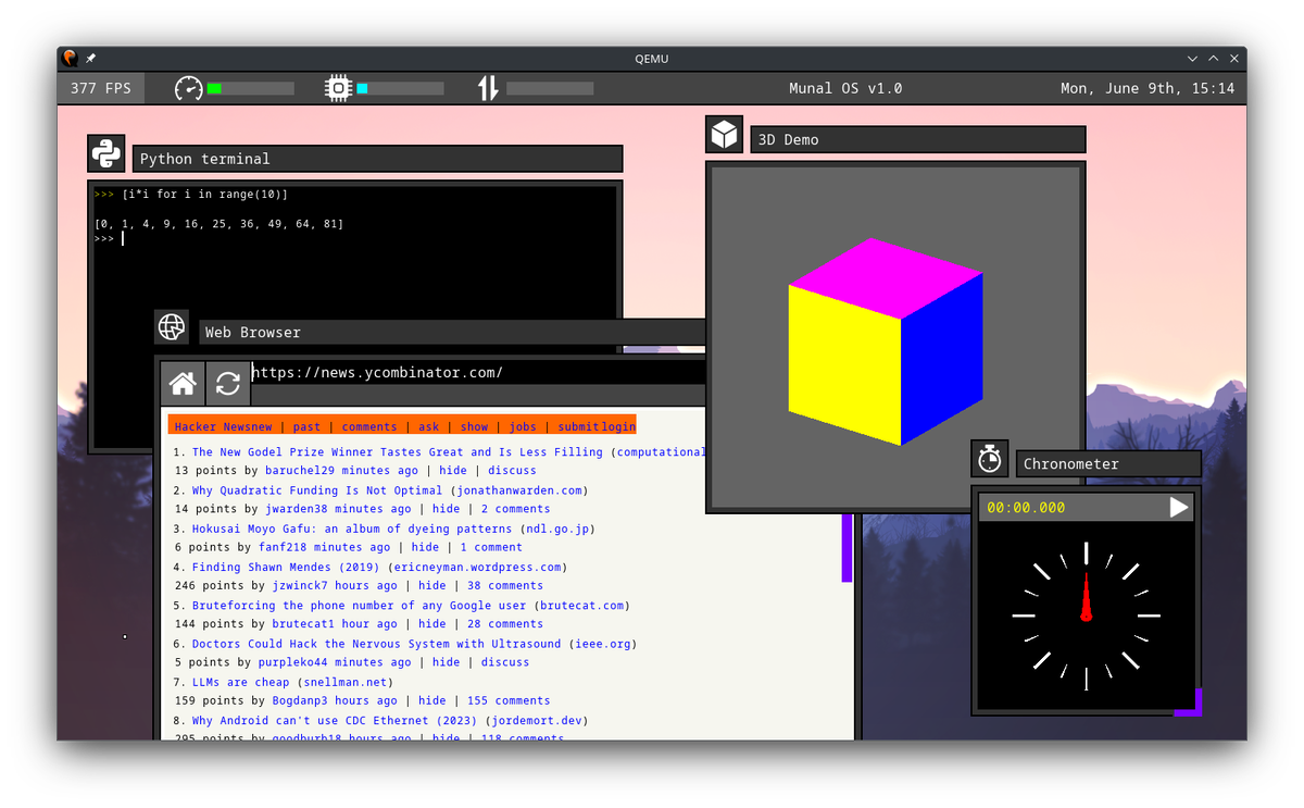 Munal OS — это экспериментальная операционная система с графическим интерфейсом, полностью написанная на Rust и работающая на основе WASM-изоляции. Она объединяет в себе идеи минимализма, безопасности и высокой модульности, предоставляя уникальный подход к построению ОС без использования виртуальной памяти, прерываний и классических загрузчиков. * Ядро и приложения в одном EFI-бинарнике: ОС загружается напрямую как UEFI-приложение, без использования GRUB или других загрузчиков. * Графический интерфейс: Имеется полноценный HD-десктоп с оконной системой, поддержкой мыши и клавиатуры, а также радиальными меню. * WASM-изоляция: Все приложения работают в песочнице WebAssembly, что обеспечивает безопасность и стабильность выполнения. * VirtIO-драйверы: Поддержка виртуальных устройств в QEMU (сетевые, графические, мышь, клавиатура) через PCI-драйверы VirtIO. * Встроенные приложения: Браузер с поддержкой HTTPS, текстовый редактор, терминал с Python-интерпретатором, графические и 3D-демо. * Uit