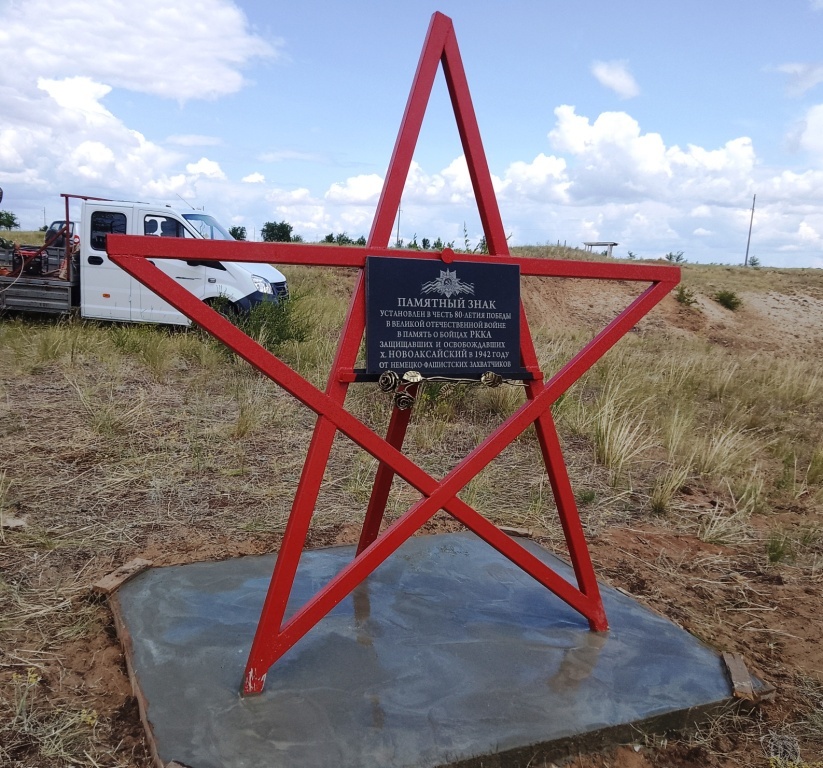 ЗАКОНЧИЛИ ОСНОВНЫЕ РАБОТЫ ПО ИЗГОТОВЛЕНИЮ И УСТАНОВКЕ ПАМЯТНОГО ЗНАКА - В ПАМЯТЬ О БОЙЦАХ РККА, ЗАЩИЩАВШИХ И ОСВОБОЖДАВШИХ Х. НОВОАКСАЙСКИЙ В 1942 ГОДУ. Памятный знак это большая пятиконечная звезда с памятной табличкой, установлен на одном из самых высоких мест, за хутором, с западной стороны, так, что все едущие люди на Цимлу или в Новоаксайские родники смогут увидеть этот памятный знак. Что хочется отметить - сплоченность хуторян. Идея установить такой памятный знак родилась у учителя истории местной школы, идею поддержали глава сельской администрации, местные жители, фермера, которые оказали посильную помощь в изготовление и установке памятного знака.
