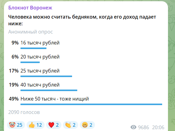 Мы решили запустить дискуссию – а, начиная с какого уровня зарплаты, людей уже следовало бы признавать бедными? В опросе поучаствовало 2090 человек. И превалирующее большинство считает, что бедняками можно признавать людей с доходом ниже 50 тыс рублей. Так ответили 49% опрошенных. 19% считает, что бедность начинается от суммы ниже 40 тысяч рублей на человека. 17% – что бедность начинается ниже 25 тысяч рублей. 6% – что бедность стартует, когда доход проседает ниже 20 тыс. И только 9% сошлись во мнении с официалитетом и заявили, что бедность наступает там, где доход падает ниже 16 тыс рублей.