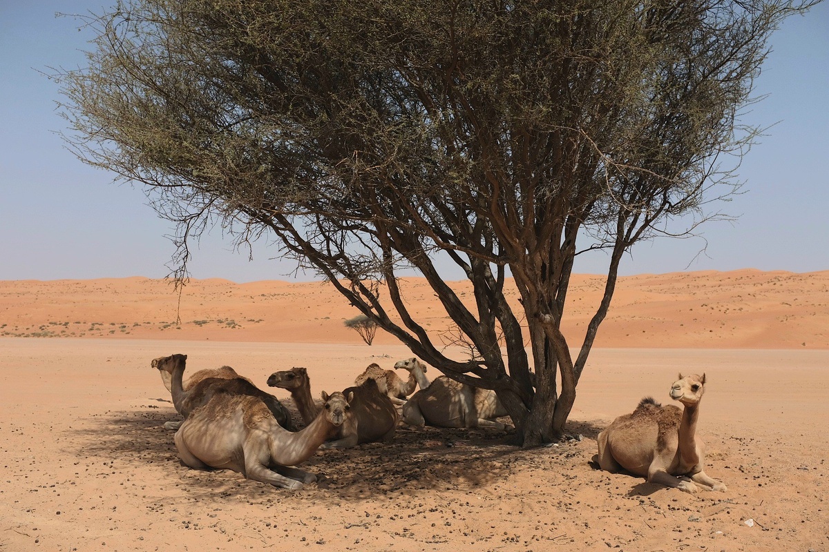 От пляжа до следующей достопримечетельности - Колодец Бимма (Bimmah Sinkhole) всего 6 км. К колодцу Бимма ведет небольшая дорога, на которой нам повстречалось несколько верблюдов:
