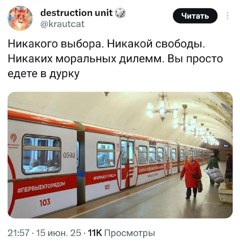 🚂 ПОЕЗД В ДУРКУ ЗАПУСТИЛИ В МОСКВЕ Вагоны с санитарами уже заметили на Арбатско-Покровской линии метро. И тут возникает вопрос: а может, это не просто шутка, а завуалированная правда? Некоторые шутят, что именно туда каждый день ездят московские работяги. Смотри скрин – там всё наглядно. Что думаешь по этому поводу? Пиши в комменты! #Москва | ВСЁ ПРО AI | AI NEWS | Дзен | ОК